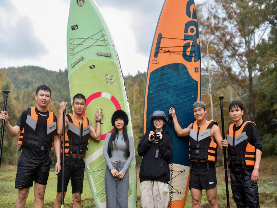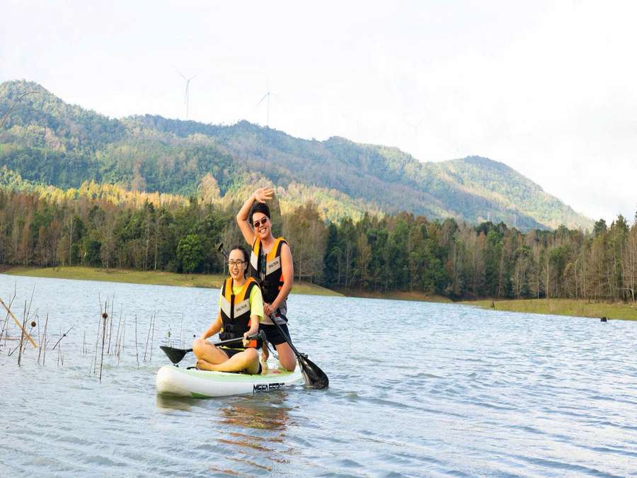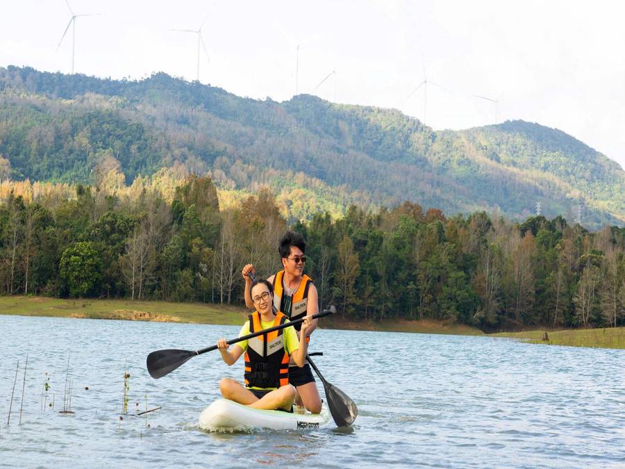 - Chèo SUP trên mặt hồ trong xanh phẳng lặng, cảm nhận làn nước mát và sự yên bình tuyệt đối ở Hồ Rào Quán.