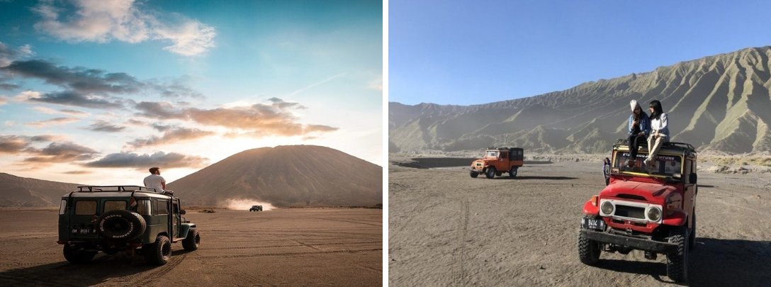 Với tour leo núi lửa Ijen – Bromo – thác Tumpak Sewu khởi hành từ Hà Nội. Bạn sẽ cảm thấy phấn khích tột độ khi ngồi trên những chiếc xe Jeep 4WD hầm hố. Tờ mờ 2 giờ 30 sáng, chiếc xe sẽ đưa bạn đến Vườn quốc gia Tengger Bromo Semeru. Vườn quốc gia là khu vực bảo tồn duy nhất ở Indonesia có biển cát dài 10km gọi là Tengger. Những cú xóc nẩy đầy hào hứng khi xe vượt qua cồn cát nhấp nhô sẽ mang lại cho bạn nguồn năng lượng vô cùng tích cực. Hình ảnh những chiếc xe Jeep bụi bặm nối đuôi nhau tạo nên một khung cảnh như phim điện ảnh. Bạn sẽ được tận hưởng cảm giác tự do tuyệt đối khi đứng trên mui xe, hít hà không khí trong lành và ngắm nhìn không gian hoang dã. Đừng ngần ngại tạo dáng check-in cực ngầu với xe Jeep khi tham gia tour leo núi Bromo bạn nhé!