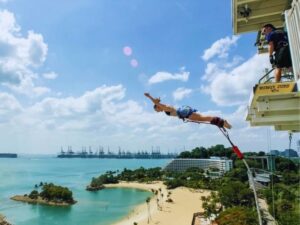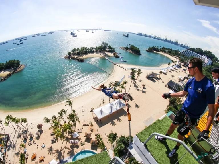 Đây là một trong những hoạt động mạo hiểm được yêu thích của đa số du khách khi du lịch tự túc tại Singapore. Hãy thử tưởng tượng bạn nhảy bungee từ độ cao 47m tại AJ Hackett Skypark Sentosa. Cảm giác rơi tự do trong 2,5 giây thật sự khiến tim bạn đập loạn nhịp. Đây là điểm nhảy bungee đầu tiên và duy nhất ở Singapore, nằm tại bãi biển Siloso. Từ trên cao, bạn sẽ thấy bãi cát trắng mịn và làn nước biển trong vắt trải dài bất tận. Bầu trời rộng lớn ôm trọn bạn giữa không khí biển mát lành của đảo Sentosa. Khoảnh khắc bungy vừa sợ hãi vừa phấn khích, chắc chắn sẽ là kỷ niệm khó quên.
